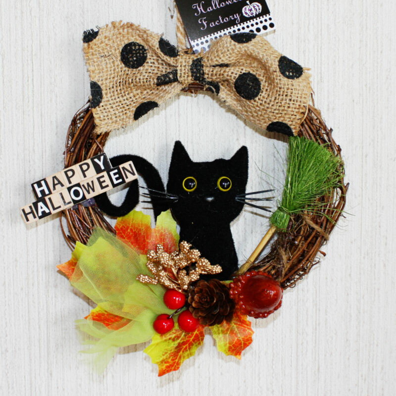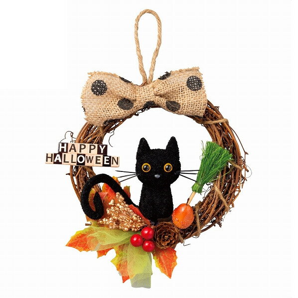 ハロウィンコーナーの商品をお求めの方に、画像のグッズの中からいずれか1個をプレゼント! (商品1点につき1個 ※プレゼント品は選べません) プレゼント一覧 A フェルトガーランド B デコジェルステッカー C フォームステッカー D パンプキンマグネット E グラスポット ハロウィングッズ [黒猫のリース] サイズ 直径16cm×厚み3.5cm 仕様 素材◆ポリエステル・発泡スチロール・天然素材 備考 小ぶりの輪っかの中央にちょこんと乗ったおすまし黒猫がキュートなリースです。