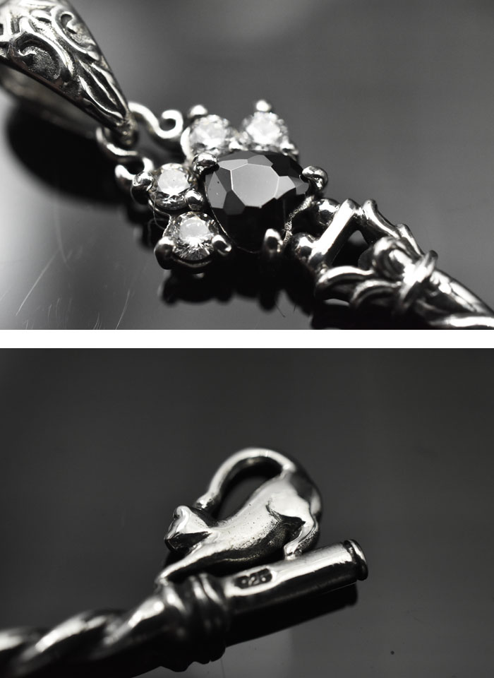 猫をモチーフにしたgoodvibrations(グッドバイブレーション)の鍵型シルバーペンダントトップです。