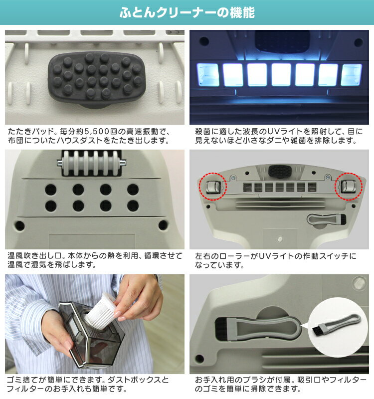 50℃以上の温風で、しっかりダニ退治! 年中活躍するコンパクトで軽い布団乾燥機と UV+温風+たたき機能付き! 弱ったダニをしっかりキャッチする、ふとんクリーナーのセットです。